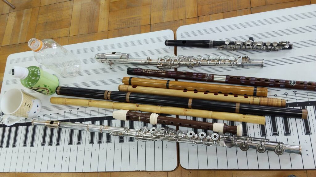 縦に吹く笛、横に吹く笛、ななめに構える笛。形や持ち方はさまざまですが、国や時代が違っても、吹いた空気が管のふちで揺れ、その振動が中の空気を震わせて音になるという共通の原理があることを伝えました。